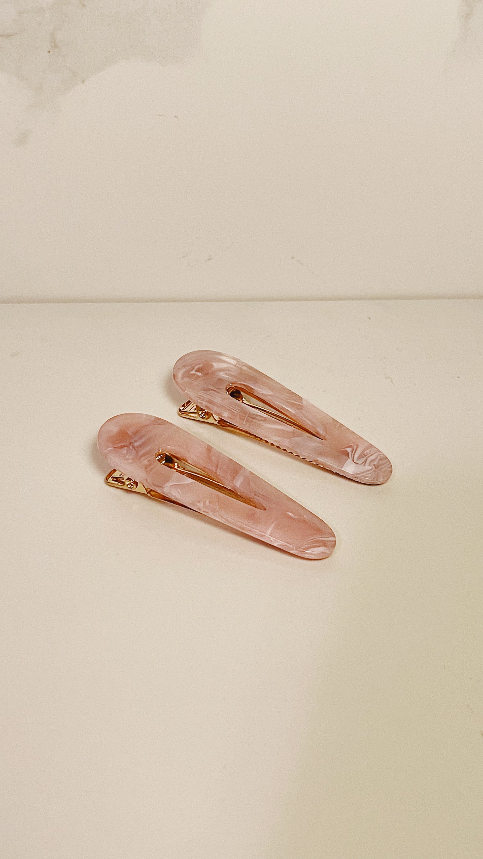Pair of gold-colored metal and pearlescent light pink acrylic hair clips