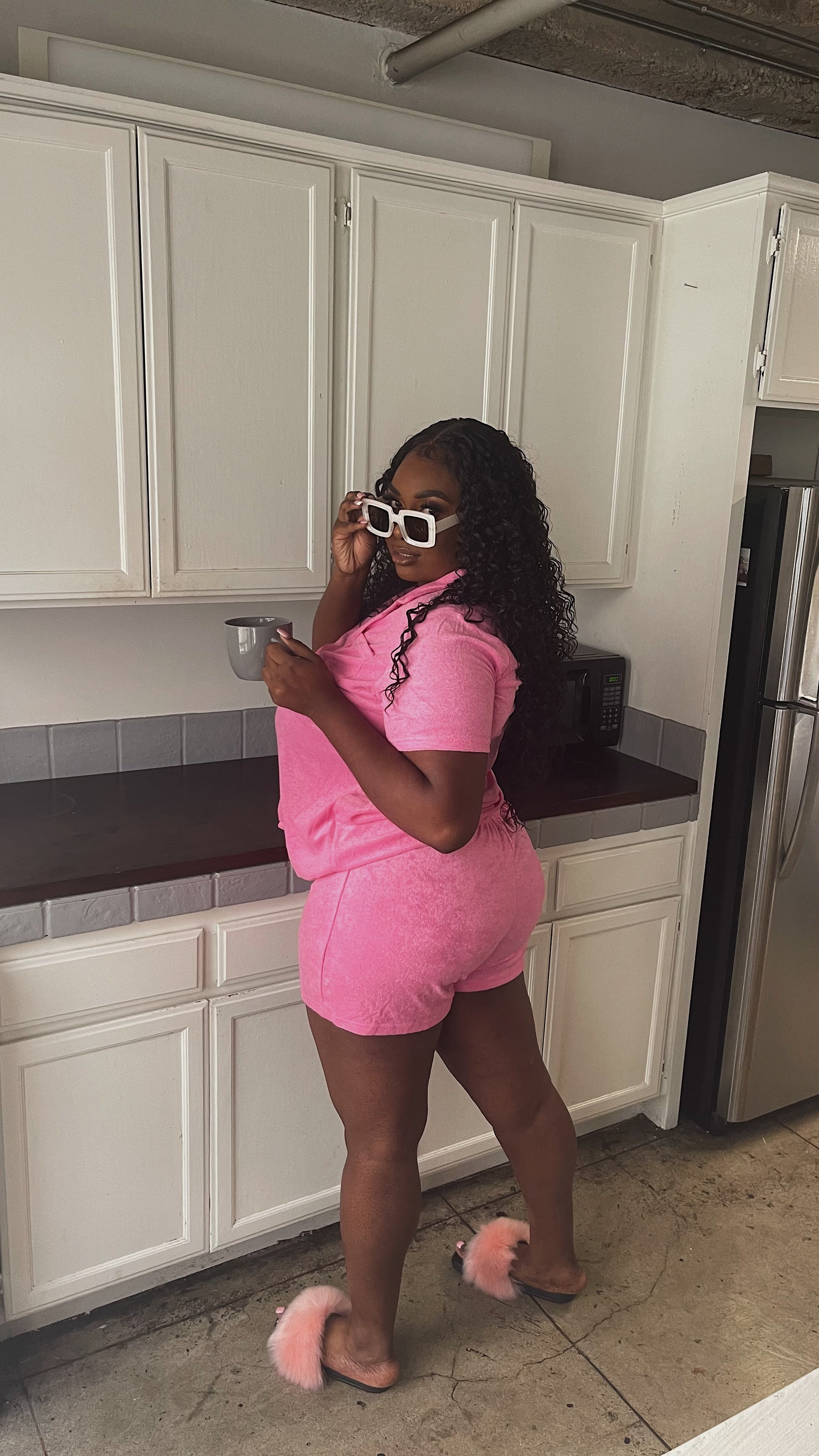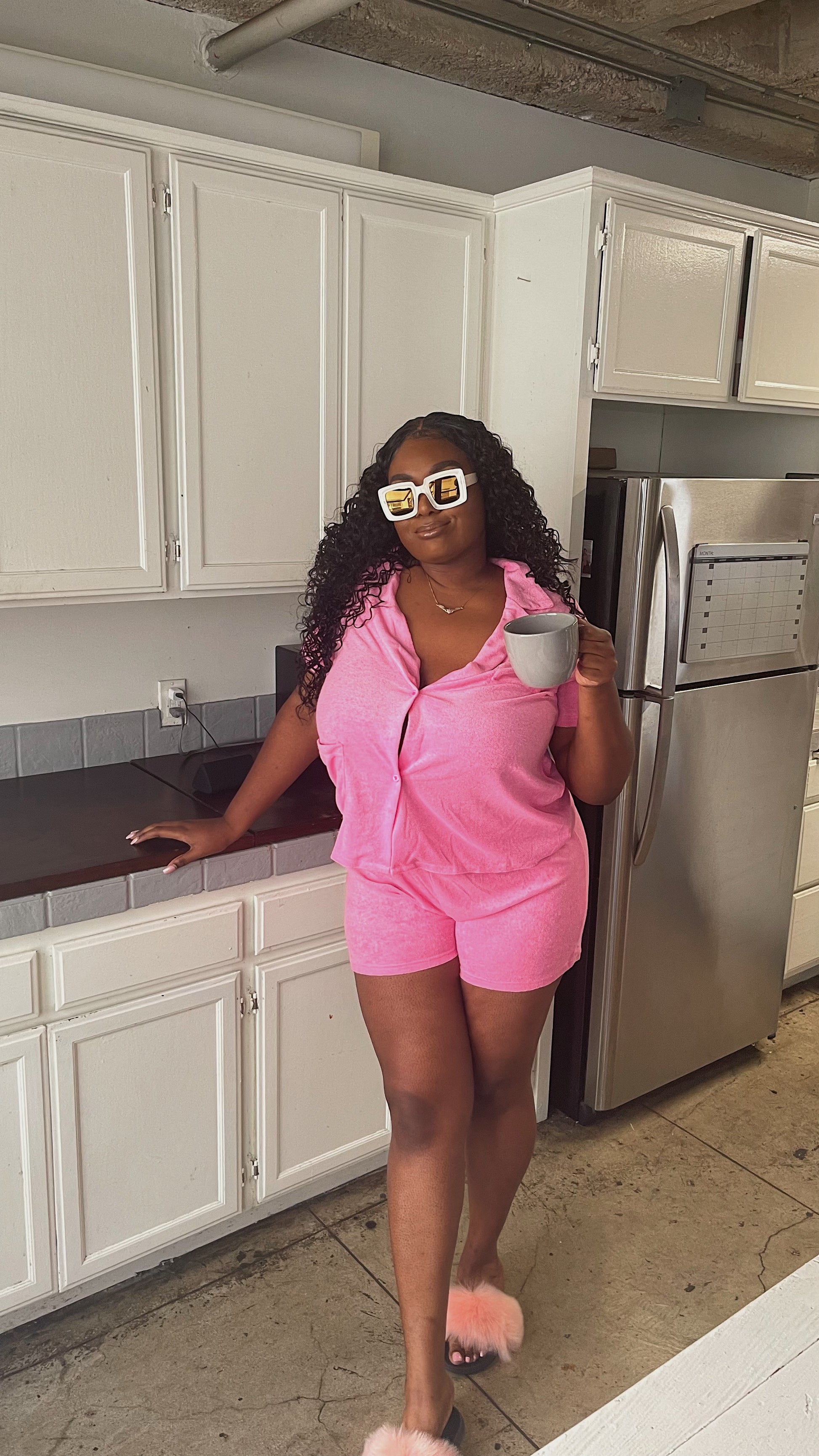 Faux-velvet button-down sleep shirt and shorts set in Fiery Pink